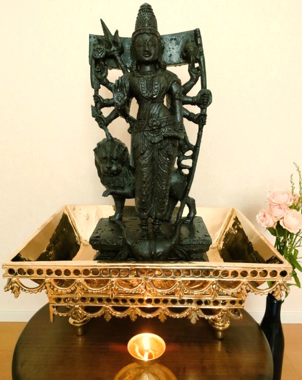 おかげさまで、このたびピーススタチューの足元に、真鍮のアビシェイク・パトラ(インドの職人さん手づくり)が据えられました。